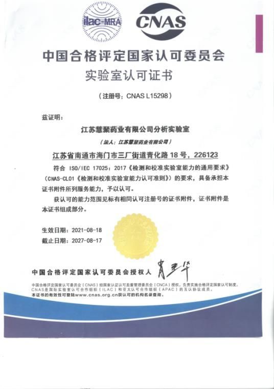 2021年8月18日,江苏LY体育·(国际)官方网站-lysport药业有限公司通过审核,取得CNAS认证证书。此次获得CNAS审核,既是对分析实验室的技术实力及体系管理实力的认可,也是LY体育·(国际)官方网站-lysport药业建设国际一流实验室道路上的关键一步。面向未来,分析实验室将继续秉承“数据准确、运转高效、行为公正、态度严谨”的质量方针,严格按照法规要求、体系要求、国际标准、国内标准认真控制各检测环节,发挥各职能部门功能,完成各项检测任务,以专业的技术支持,确保检测报告的准确及时,持续提升客户满意度。